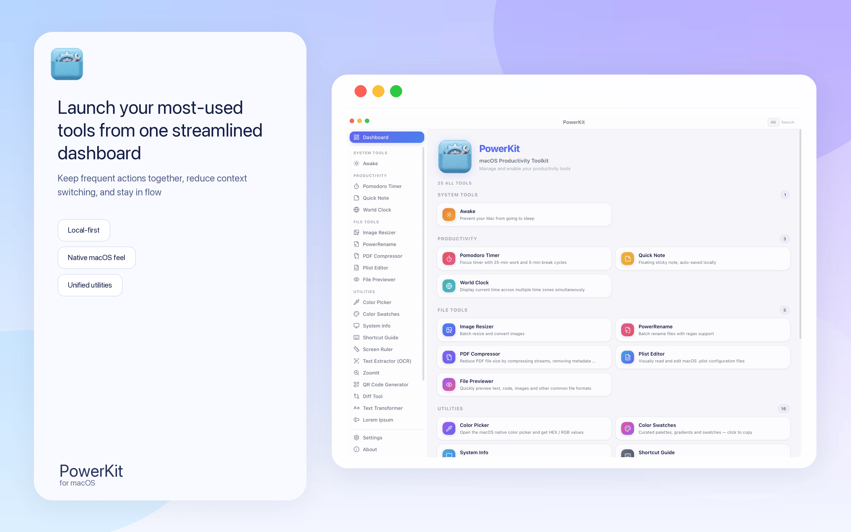 PowerKit is a local-first utility workspace for macOS that brings image, text, file, and everyday reference tools into one clean desktop app.